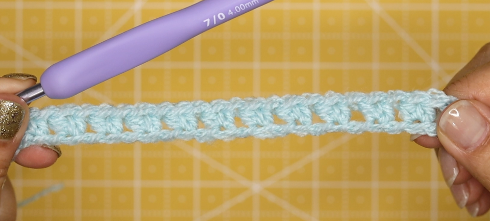 To start the first row, make 2 half-double crochet on the 4th chain from the hook, the chain 3 space will not be counted as a stitch. * [skip the next chain, make 2 half-double crochet into the next chain]. Repeat * until there’s 1 chain left. Simple make 1 half-double crochet into the last chain. You should have 23 stitches total for this row.